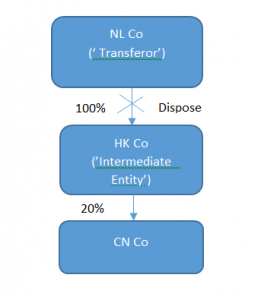 A Dutch tax resident enterprise (‘NL Co’) wholly owns an entity in Hong Kong (‘HK Co’), which holds a 20% of the equity interest in a Chinese resident entity (‘CN Co’), which is depicted below: